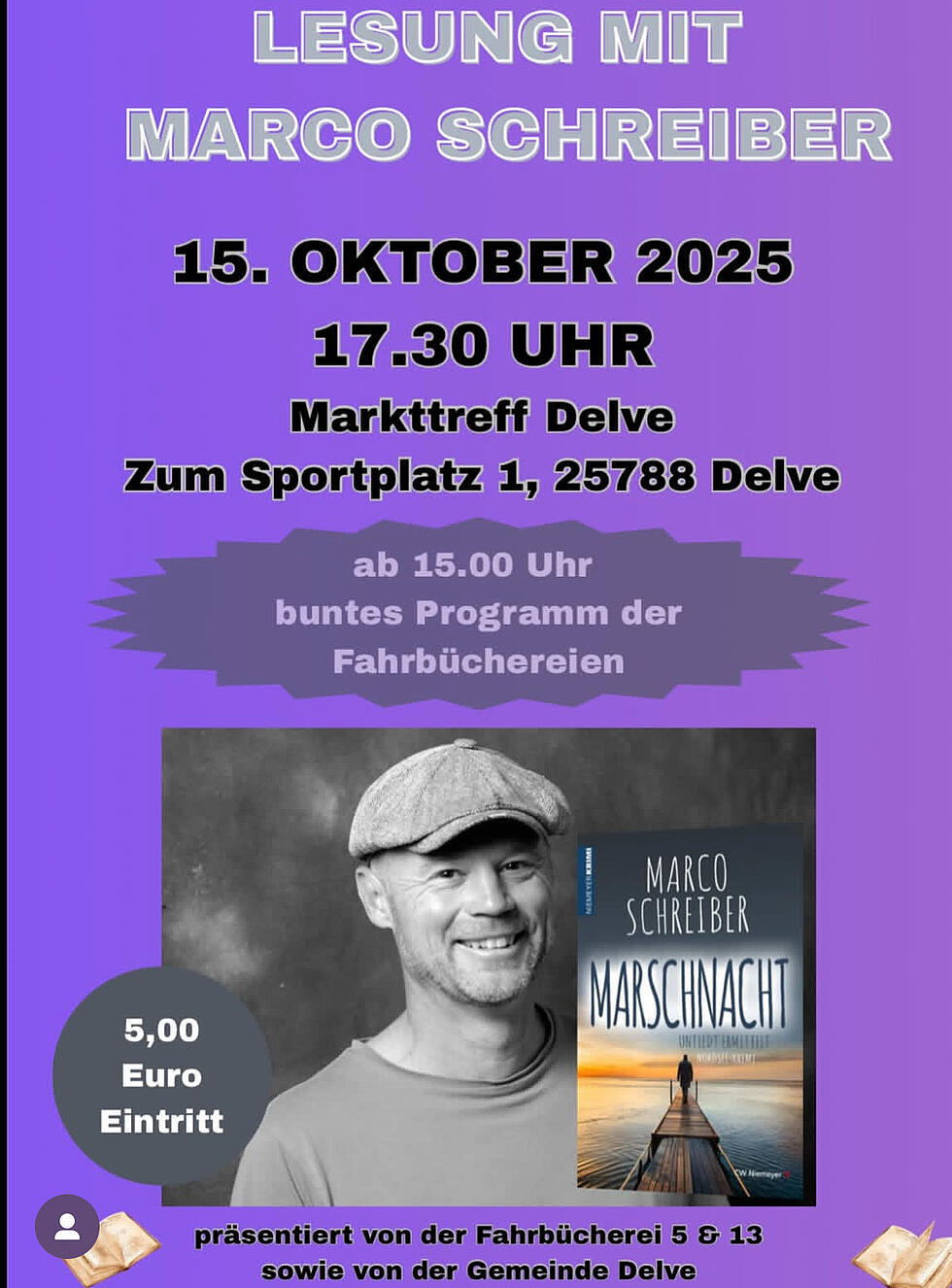 Am 15.10.2025 wird in Delve am Markttreff Marco Schreiber zu Gast sein. Die Lesung des Krimiautors beginnt um 17:30 Uhr.